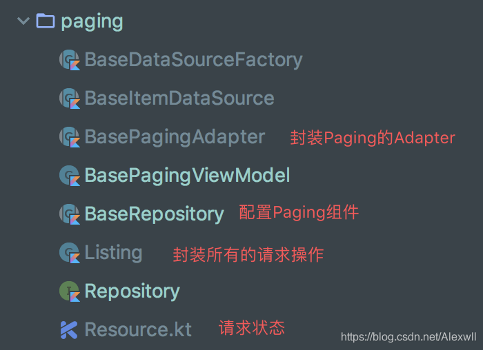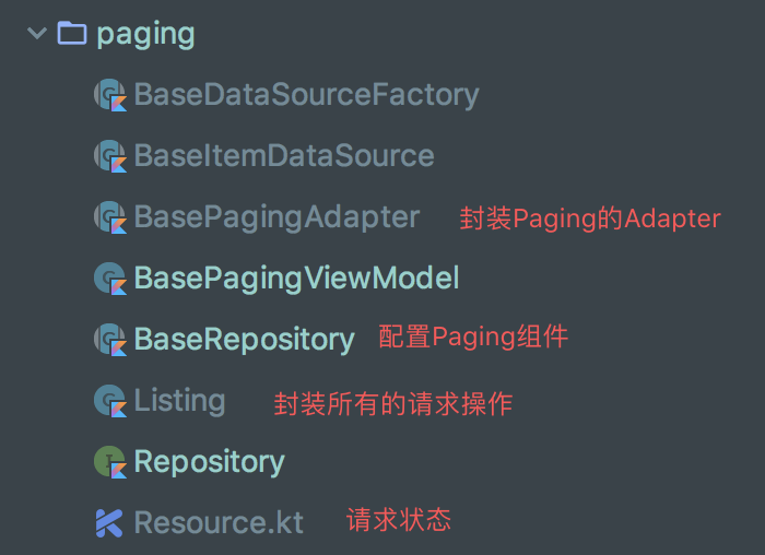 对于常规的内容展示,使用RecyclerView并实现上拉加载和下拉刷新即可,此处使用Paging组件实现这些功能,对于Paging的下拉加载之前文章已经介绍了,通过自定以DataSource控制数据的加载和分页,本文不再进行介绍,这里只介绍对Paging组件进行了简单的封装,代码结构如下: