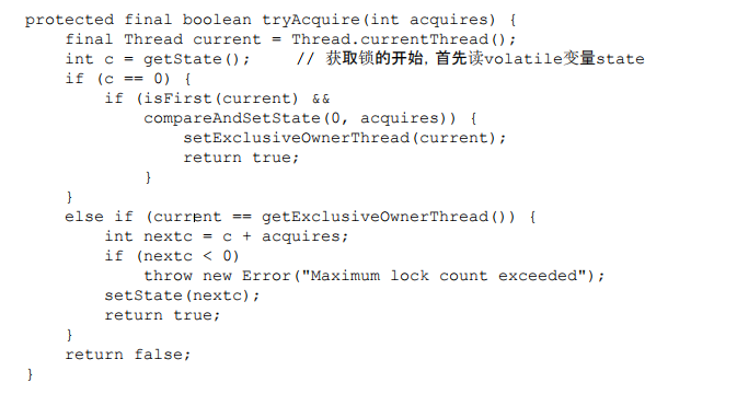 从上面源代码中我们可以看出,加锁方法首先读volatile变量state。