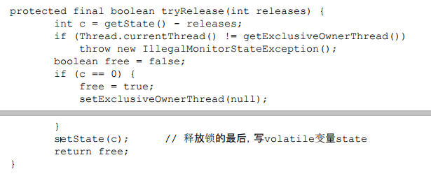 从上面的源代码可以看出,在释放锁的最后写volatile变量state.