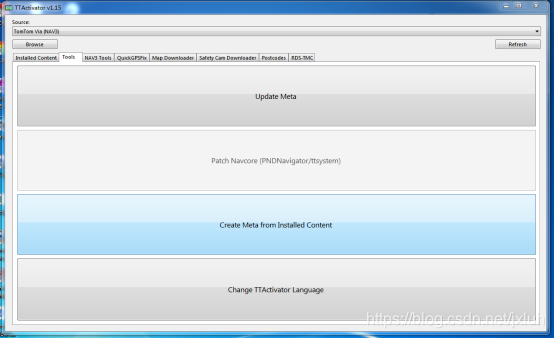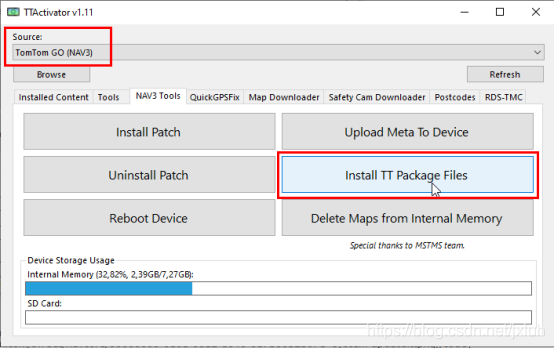 1、将TOMTOM导航仪通过USB线与电脑相连,运行TTActivator,在读取设备时可能需要一些时间才能启动。如果未检测到设备,请按“Refresh”。(运行TTActivator时需始终关闭MyDrive Connect,因为它们会相互干扰),当第一行“source”出现设备名称时,说明已连接,如机器版本低于前述,按照机器与navcore的对应,点击“Install TT Package Files”升级安装固件。