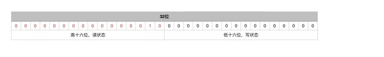 在独享锁中这个值通常是0或者1(如果是重入锁的话state值就是重入的次数),在共享锁中state就是持有锁的数量。但是在ReentrantReadWriteLock中有读、写两把锁,所以需要在一个整型变量state上分别描述读锁和写锁的数量(或者也可以叫状态)。于是将state变量“按位切割”切分成了两个部分,高16位表示读锁状态(读锁个数),低16位表示写锁状态(写锁个数)。如下图所示:
