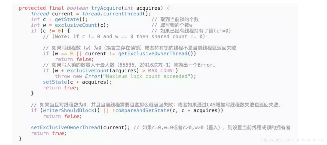 这段代码首先取到当前锁的个数c,然后再通过c来获取写锁的个数w。因为写锁是低16位,所以取低16位的最大值与当前的c做与运算( int w = exclusiveCount(c); ),高16位和0与运算后是0,剩下的就是低位运算的值,同时也是持有写锁的线程数目。