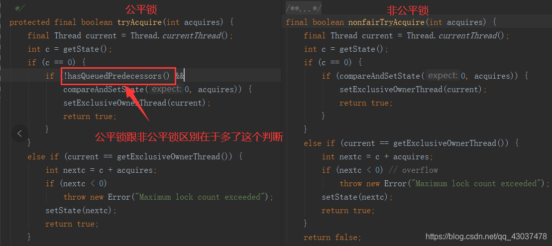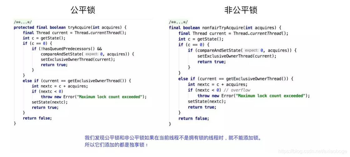 此时,我们再回头看一下互斥锁ReentrantLock中公平锁和非公平锁的加锁源码: