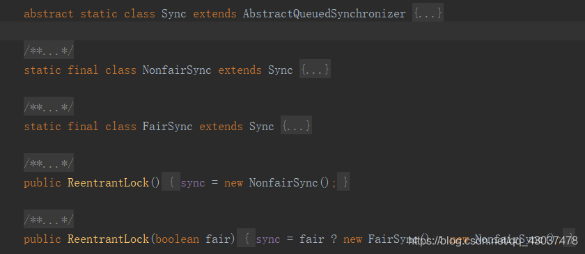 根据代码可知,ReentrantLock里面有一个内部类Sync,Sync继承AQS(AbstractQueuedSynchronizer),添加锁和释放锁的大部分操作实际上都是在Sync中实现的。它有公平锁FairSync和非公平锁NonfairSync两个子类。ReentrantLock默认使用非公平锁,也可以通过构造器来显示的指定使用公平锁。