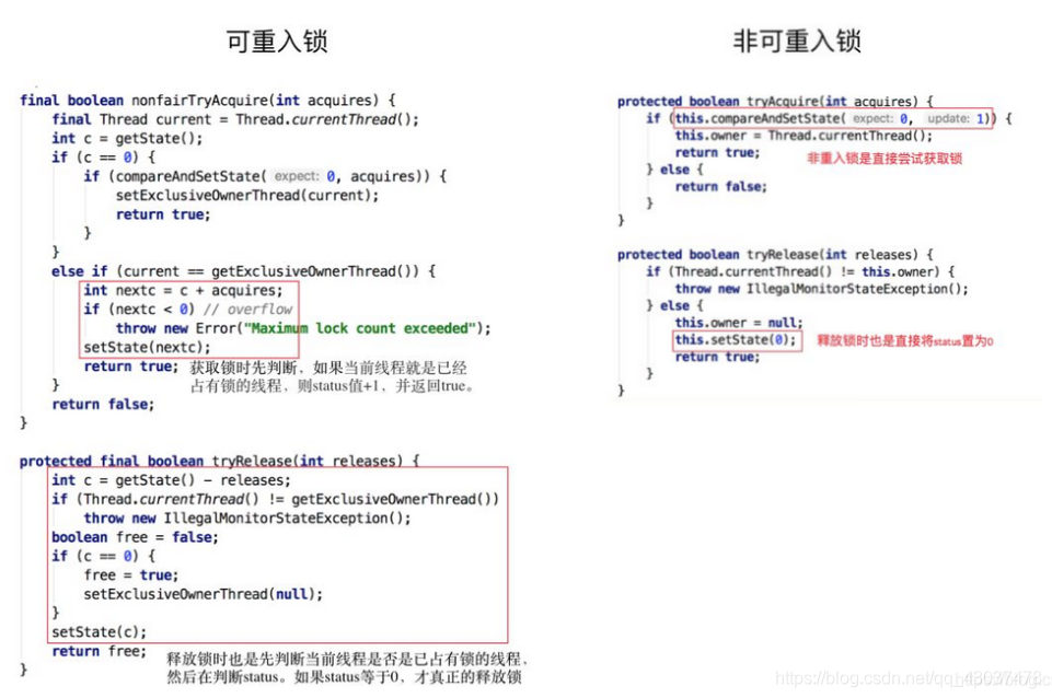 当线程尝试获取锁时,可重入锁先尝试获取并更新status值,如果status == 0表示没有其他线程在执行同步代码,则把status置为1,当前线程开始执行。如果status != 0,则判断当前线程是否是获取到这个锁的线程,如果是的话执行status+1,且当前线程可以再次获取锁。而非可重入锁是直接去获取并尝试更新当前status的值,如果status != 0的话会导致其获取锁失败,当前线程阻塞。