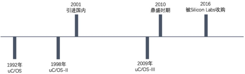 如下图所示,uC/OS最早于1992年正式发布,1998年发布了uC/OS-II版本,最新的版本则是uC/OS-III,国内比较流行的是uC/OS-II。除任务管理、时间管理、内存管理、通信与同步等操作系统基本功能外,uC/OS还提供了TCP/IP、USB、CAN和Modbus等功能组件,但其网络功能相对来说比较薄弱。uC/OS采用的是开源不免费的策略,商业使用它需要缴纳授权费用。从其在国内的发展过程来看,2010年是uC/OS的鼎盛时期,可能也正是因为“开源不免费”的策略导致它在2010年后迅速地被FreeRTOS超越。uC/OS在2016年的时候被Silicon Labs公司收购了。