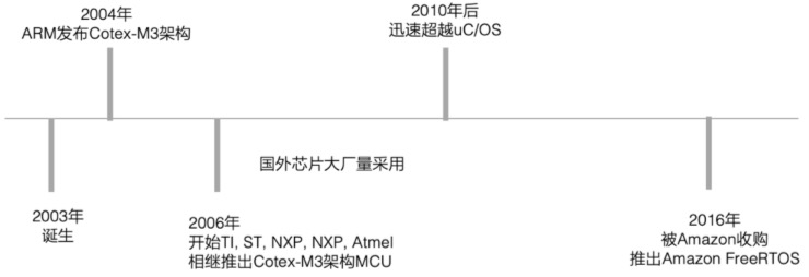 如图下图所示,FreeRTOS嵌入式操作系统诞生于2003年,采用MIT License,开源免费,适用于任何商业或非商业场合。在ARM在2004年推出Cotex-M3系列架构的IP之后,TI,ST,NXP,Atmel等国外芯片公司在约2006年的时候都相继推出基于Cotex-M3的MCU,这些芯片默认搭载的都是FreeRTOS操作系统,这就直接促使了FreeRTOS在2010年的时候迅速超越uC/OS成为第一大嵌入式操作系统。FreeRTOS在2016年被Amazon公司正式收购,Amazon将自己的AWS服务内嵌到FreeRTOS系统中,并于2017年推出了集成无线连接、安全、OTA等功能的物联网操作系统。
