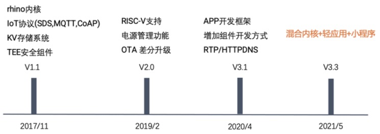 - 2017年AliOS Things V1.1版本正式发布,除了rhino内核外,还集成了常用的MQTT/CoAP等非常适合物联网行业的协议和TEE安全组件,所以AliOS Things天生就是为物联网行业而生的。