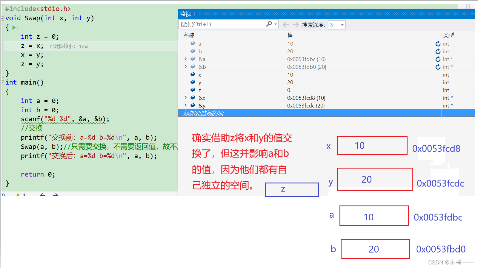 调用Swap函数后,再借助z,确实将x和y的值互换了,但是这并不影响a和b的值,因为它们都有自己独立的空间。
