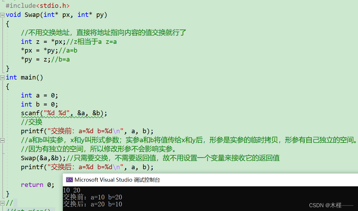 如上图中main函数内的add()内的a和b,Swap()中的&a和&b是实参,而add()函数内的x和y,Swap()函数内的*px和*py是形参。