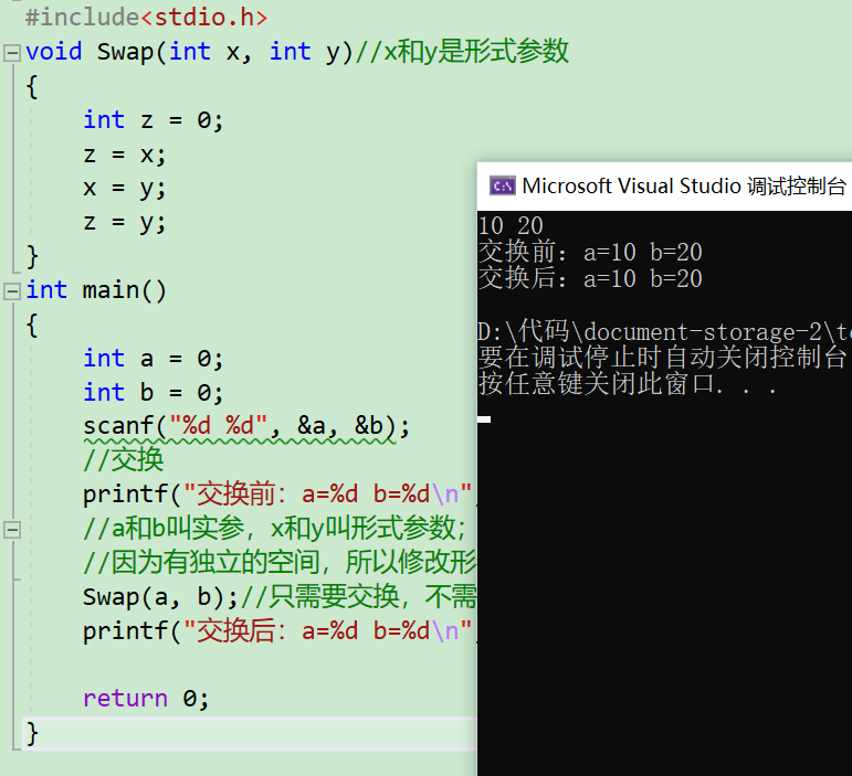 printf("交换前:a=%d b=%d\n", a, b);//a和b是实参