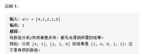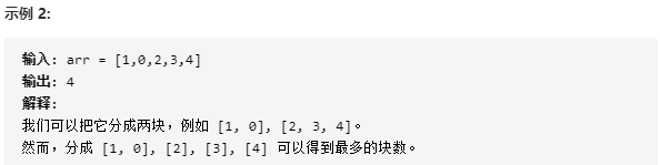 - 题目描述:数组arr是[0, 1, …, arr.length - 1]的一种排列,我们将这个数组分割成几个“块”,并将这些块分别进行排序。之后再连接起来,使得连接的结果和按升序排序后的原数组相同。我们最多能将数组分成多少块?