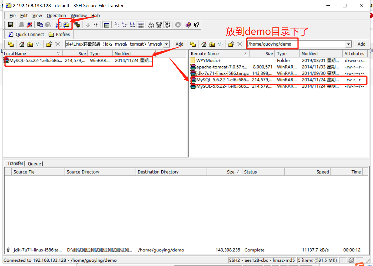 一、使用SSH传输mysql到Linux的demo文件夹下