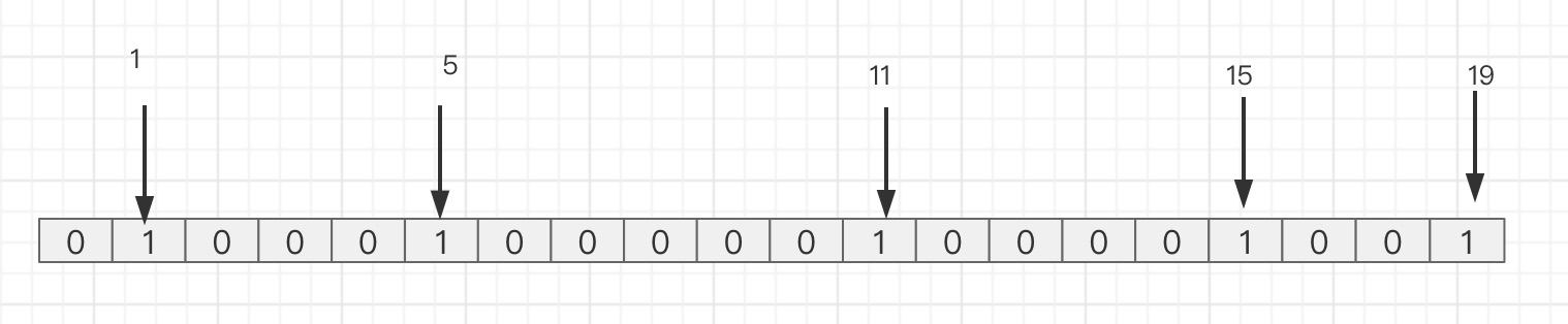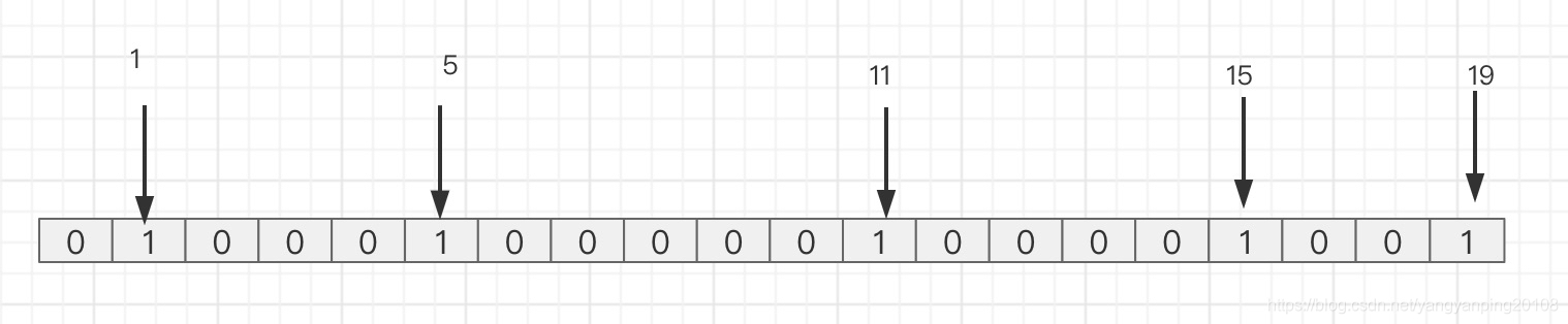 设置键的第 offset 个位的值 (从0算起) ,假设现在由20个用户,userId= 2,6,12,16,20 的用户对网站进行了访问(用户Id 减 1 为 数组下标),那么当前BitMap 初始化结果如图: