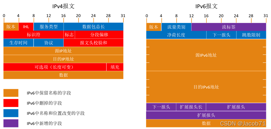 - 标识符、标志和分段偏移等三个字段用于IPv4数据包的分段与重组,IPv6报文在网络设备中不允许进行分片操作,因此从IPv6报文头中却掉。但是IPv6允许源主机对报文进行分片,这时将增加IPv6分片扩展报头。实际上,这三个字段移动到分片扩展报头中