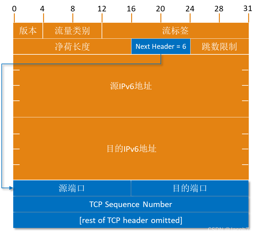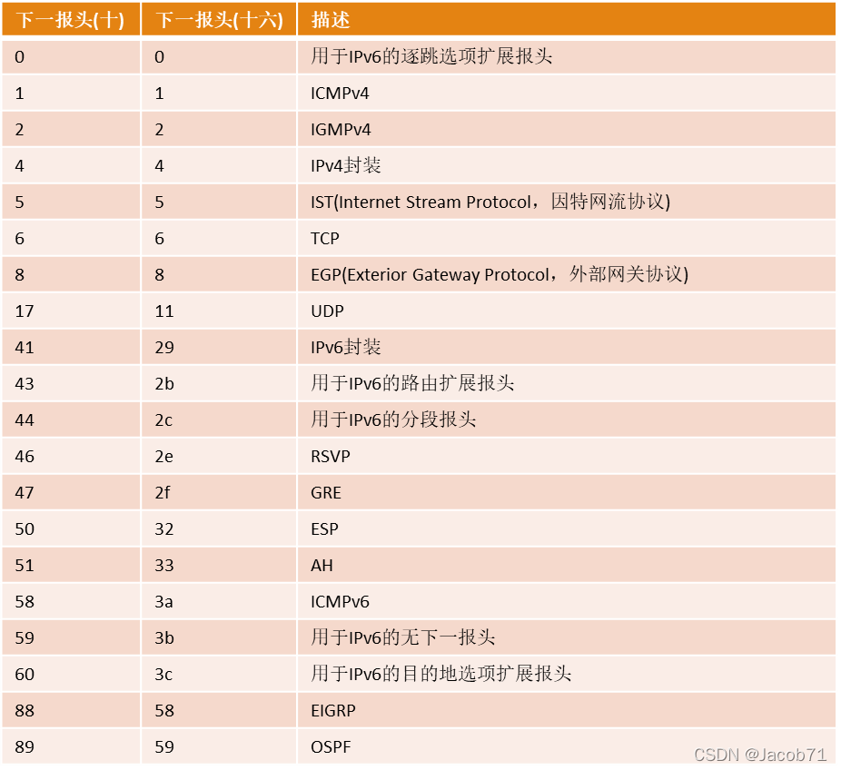 - 下一报头(Next Header):8 bits,指示基本报文头后的扩展报文头,如果没有扩展报文头,则指示数据部分所承载的协议