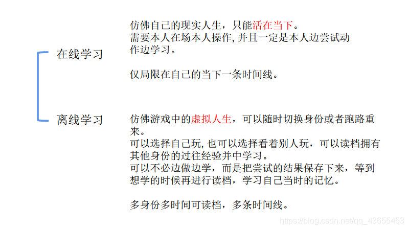 可以选择自己玩, 也可以选择看着别人玩,可以读档拥有其他身份的过往经验并中学习。可以不必边做边学,而是把尝试的结果保存下来,等到想学的时候再进行读档,学习自己当时的记忆。