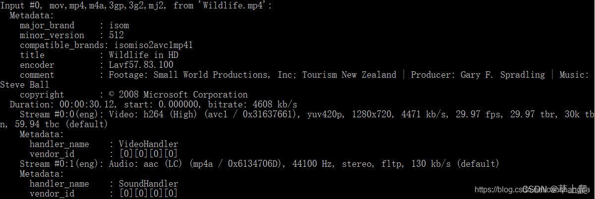 首先要使用ffmpeg查看mp4文件的一些信息,比如编码器类型、像素格式、分辨率、帧率等。