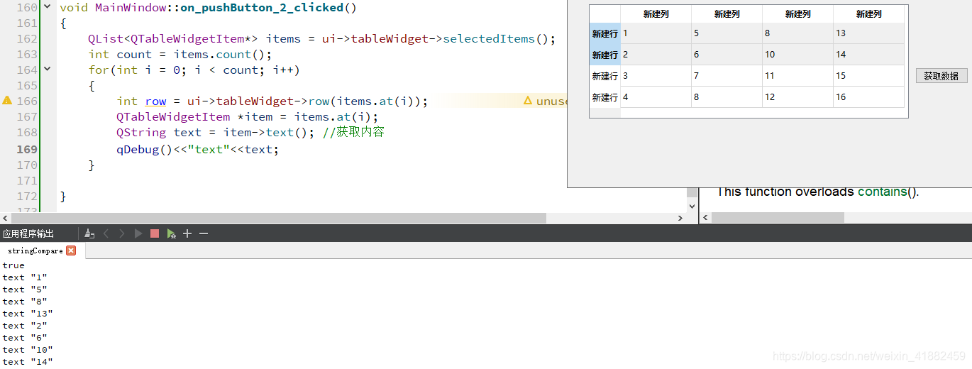 connect(tableWidget,SIGNAL(itemClicked(QTreeWidgetItem*,int)),this, SLOT( getItem(QTreeWidgetItem*,int)) );20、 获得双击单元格的内容