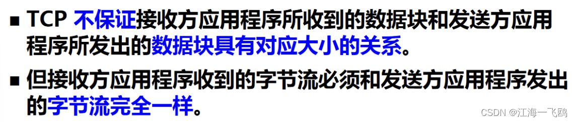 面向字节流:TCP中的流(stream)指流入或流出进程的字节序列,面向字节流的含义是,虽然应用程序和TCP的交互是一次一个数据块,但TCP把应用程序交下来的数据看成仅仅是一连串无结构的字节流