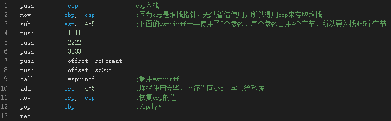 在 MASM 里面,有一条更方便的语句,就是 invoke,使用它后,你就不用自己做这些事情了。