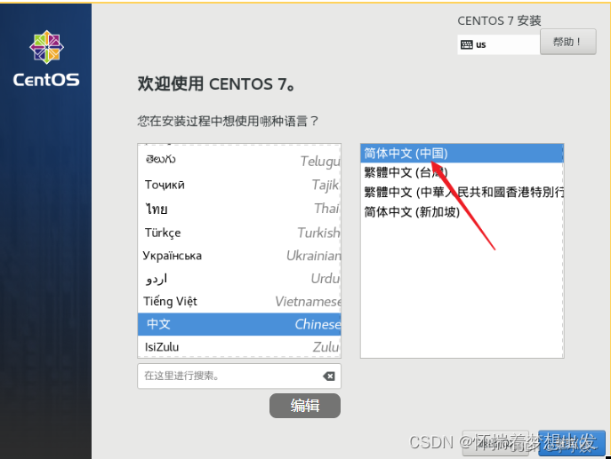 5、选择使用哪种语言,推荐使用英文。但如果是第一次安装,建议先安装中文版的熟悉一下,之后再选择英文的进行实践,这里就介绍中文的,下滑至底部选择中文。