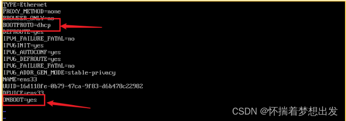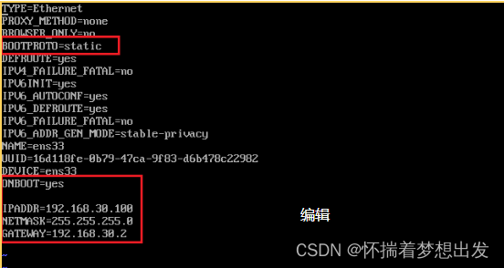 vi ifcfg-ens33。按 i 进入insert编辑模式,