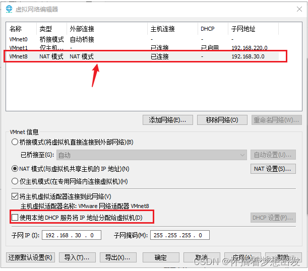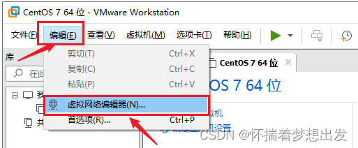①、点击“编辑”里面的“虚拟网络编辑器”,取消勾选DHCP服务将IP地址分配给虚拟机。