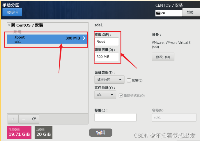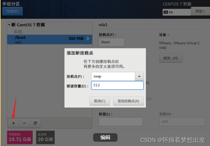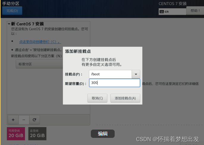 13、添加 /boot分区,用来放启动文件,大小300MB足矣,然后点击“添加挂载点”。