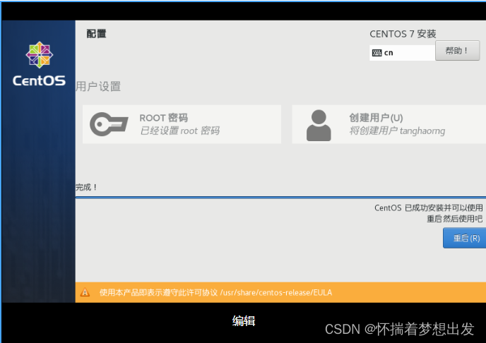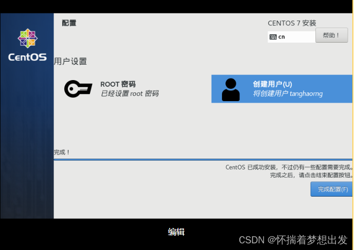 20、用户设置好了之后,等待CentOS安装完成,,然后点击“完成配置”。