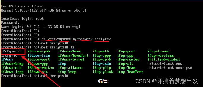 ②、启动虚拟机,进入网络配置文件目录:cd /etc/sysconfig/network-scripts/,然后编辑ifcfg-ens33文件:vi ifcfg-ens33。按shift+i进入insert编辑模式,