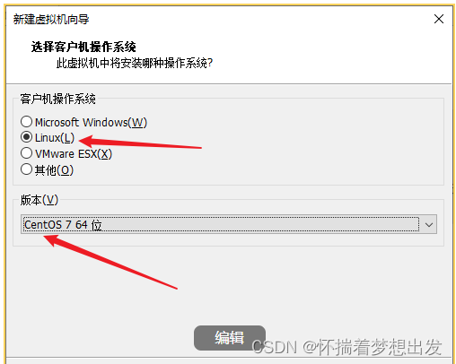 4、客户机操作选择“Linux”,版本选择“CentOS 7 64位”,点击下一步。