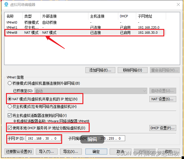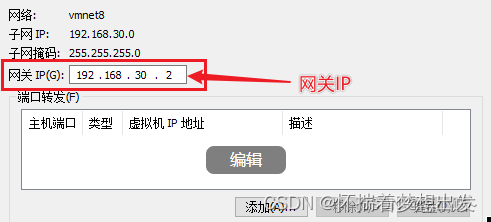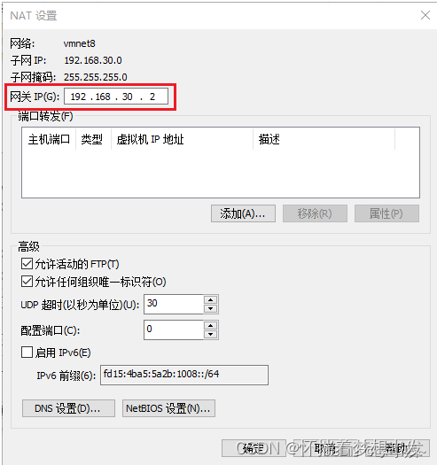 ③、点击NAT模式旁边的“NAT设置”,然后修改与子网IP同网段下的网关IP,就是前三位必须相同,即192.168.30要相同,最后一位数不相同即可(其实已经自动设置好了,默认),最后点击“确认”保存设置。