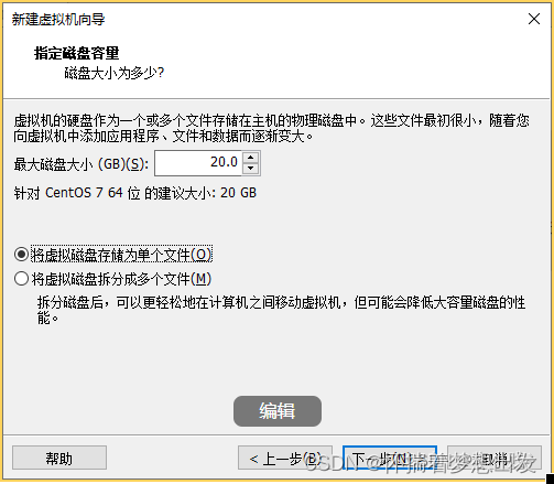 6、最大磁盘默认20G大小即可,然后选择“将虚拟机磁盘存储为单个文件”,下一步。