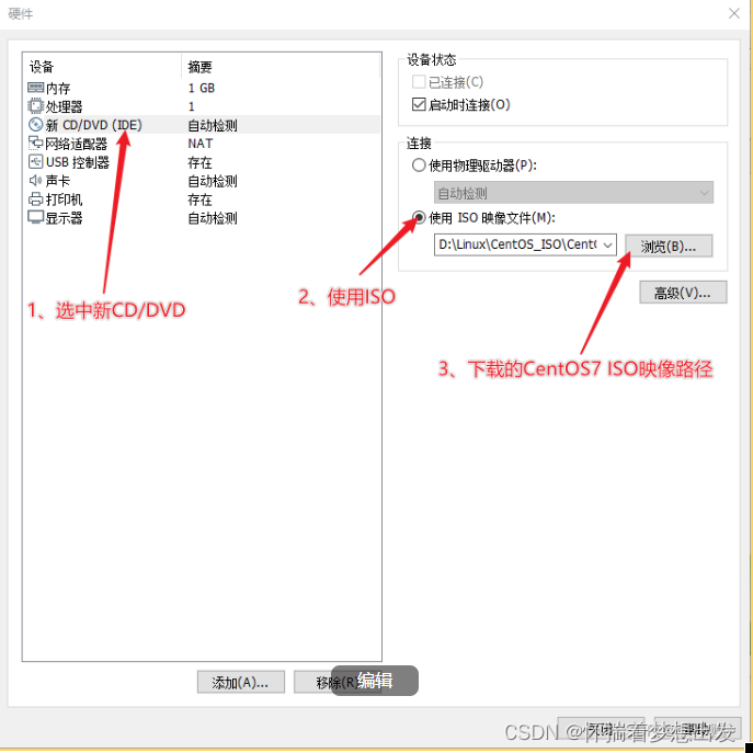 8、选中”新CD/DVD“,选择”使用ISO映像文件“,然后设置CentOS7的ISO映像路径,点击关闭。