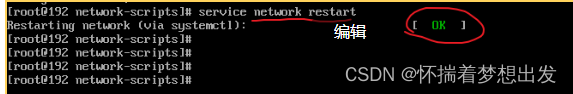 ⑥、配置完成之后输入:service network restart,重启网卡让网卡设置生效,之后就可以上网了。