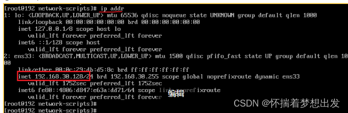 ⑦、输入ip addr检查一下动态分配的IP,可以发现分配的动态IP为192.168.30.128。