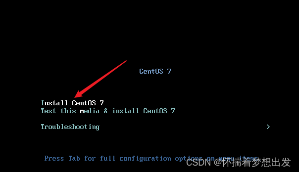 2、虚拟机启动之后会出现如下界面(白色表示选中),默认选中的是Test this media & install CentOS 7。