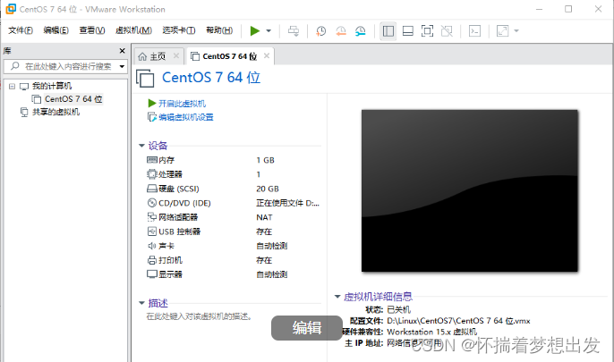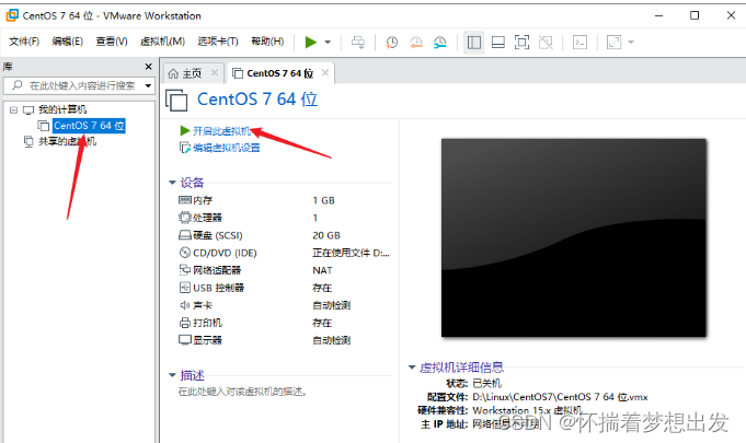 1、选中刚刚配置的CentOS7,然后点击“开启此虚拟机”。
