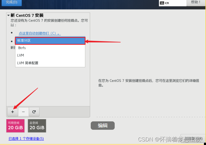 12、手动分区我们要选择标准分区,然后点击下面的“+”添加分区。
