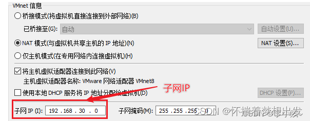 注意:IPADDR不能和子网IP冲突(最后一位只要在0~255范围内随便取一个数字,这里选择100),GATEWAY即”NAT设置“里面的网关IP。