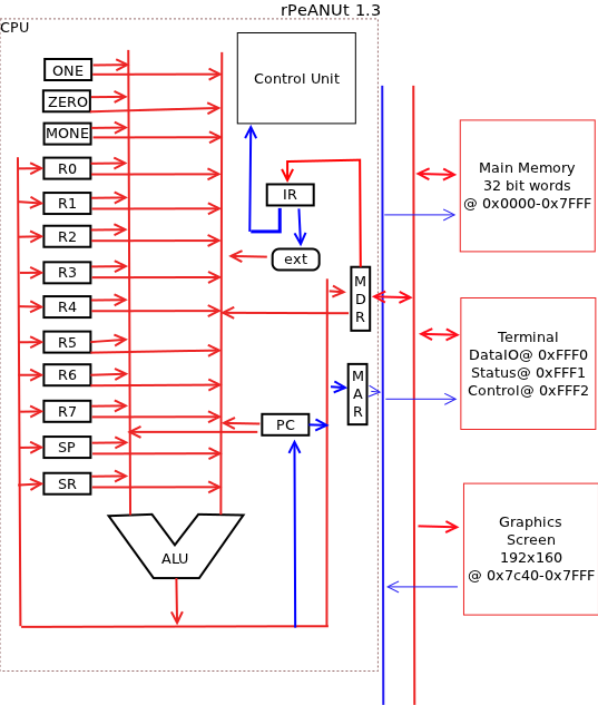 rPeANUt是一个32位微处理器,拥有16位地址、32位寄存器以及可寻址的字长32位内存存储。最大的地址存储数目是216=65536字长即262144字节(256K)。只有0x0000到0x7FFF地址被用于实际存储,0x8000到0XFFFF地址用于内存的IO映射(实际上只有3个地址单元被使用)。当微处理器重置指令寄存器(IP)为0x0200,因此通常一个程序会被装载到这个位置执行。0x0000到0x00FF地址被保留用于中断向量和其他操作系统代码,而且实存最后的960个单位被用作缓冲区。