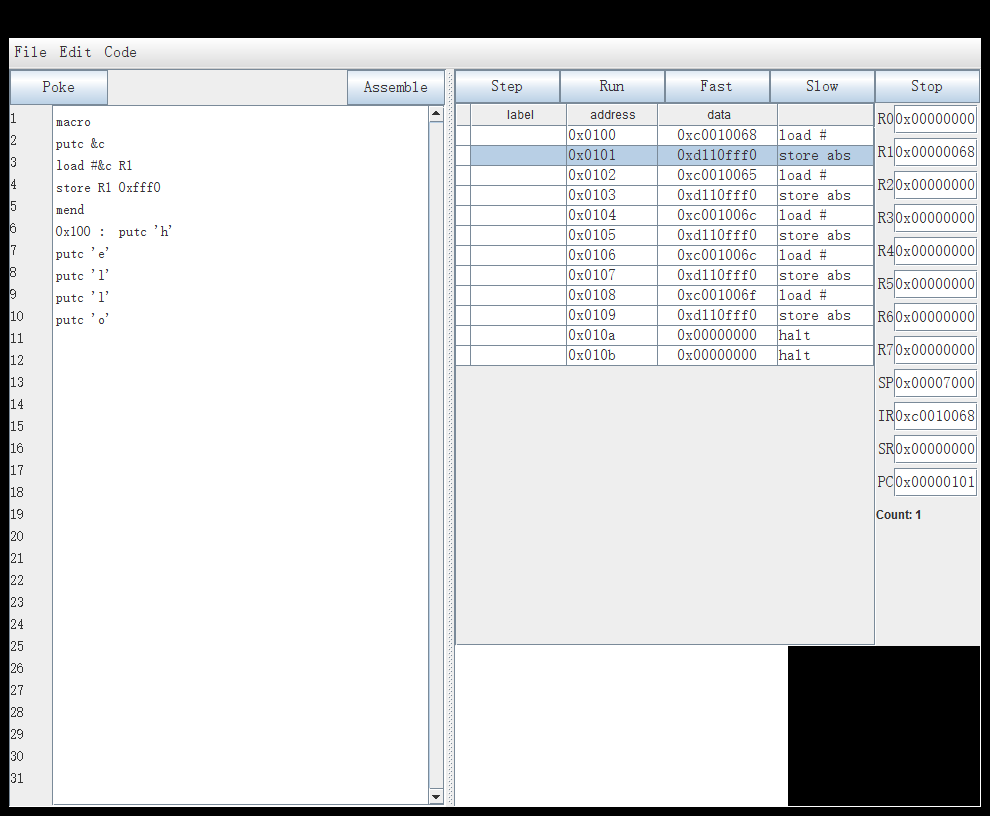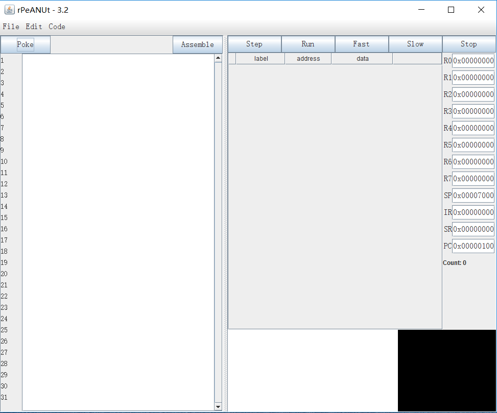 左侧白色区域用于输入代码编程,边框处数字用于标示行号,右下角区域白色、黑色屏幕用于显示输入结果,右侧灰色区域在点击Assemble后显示硬件内部执行顺序,边框处各寄存器名称后显示内部存储的数据。Count用于记步,Step为按步执行,Run顺序执行,fast、slow表示执行时的速度,Stop用于暂停执行,Poke用于设置地址与值。菜单栏可以完成文本保存、打开,字体大小以及其他详细设置。