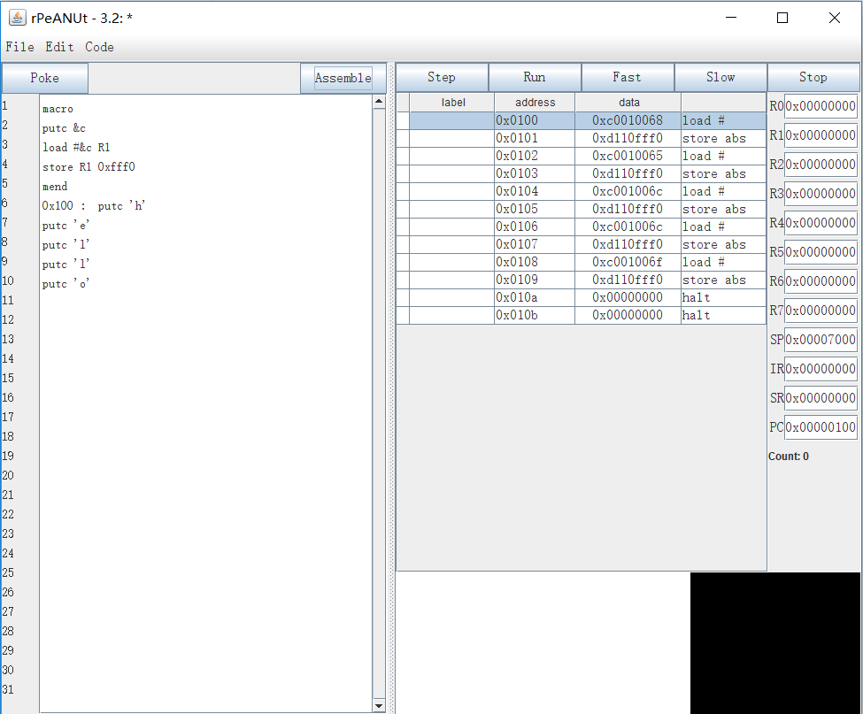 rPeANUt是一个汇编机微处理器,可以在其中进行基本的代码开发和理解真实的微处理器内部是如何进行处理的(即硬件内部的执行步骤)。