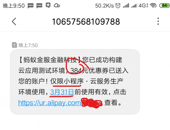 就在昨天,博主收到了蚂蚁金服的一条短信。说是可以申请支付宝小程序的开发了。