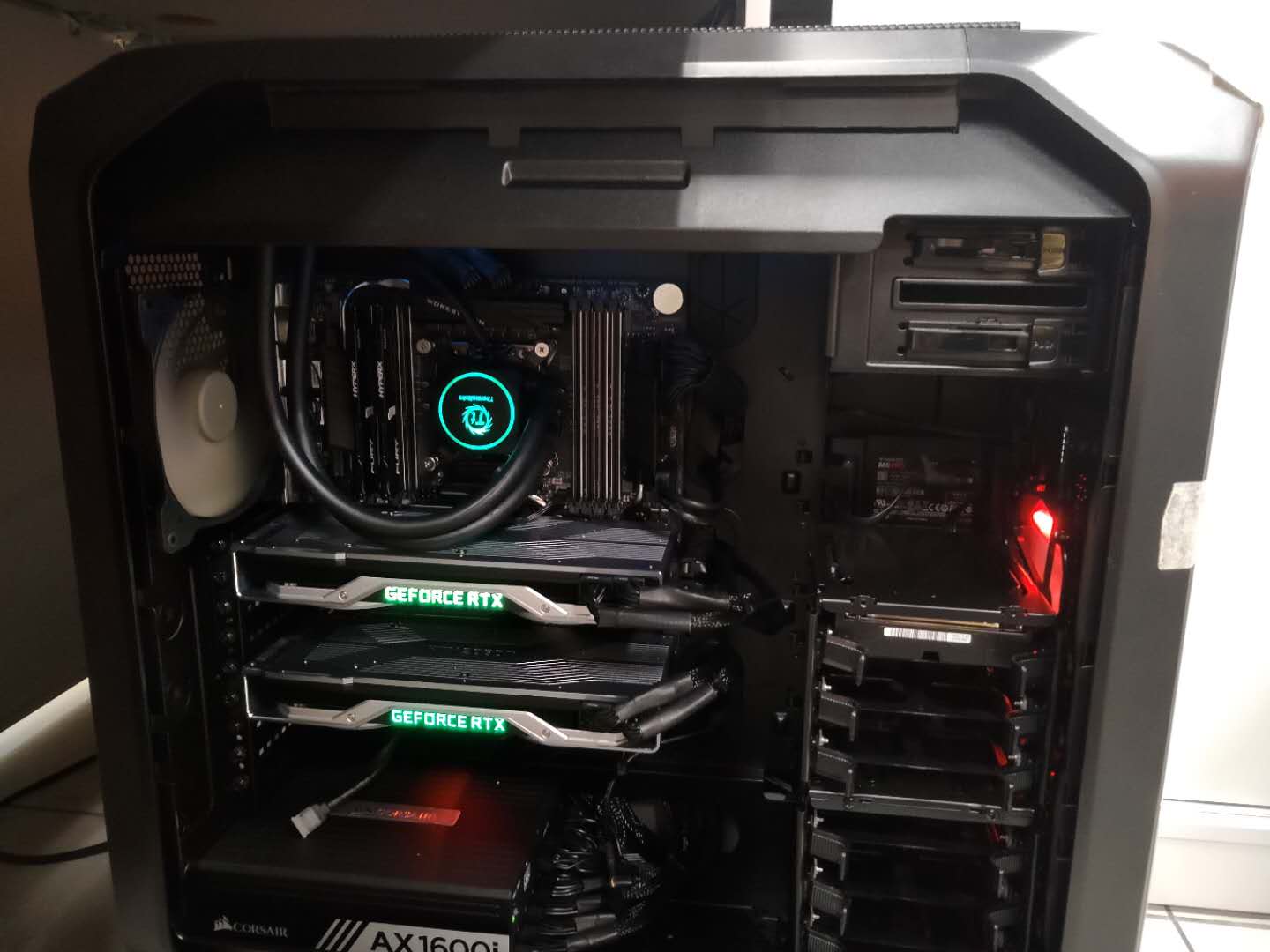 买了CPU之后芯片接口定下了LGA2066,主板的类型定下了X299,另外还需要能支持4GPU的PCIe数量和距离。在没有特殊散热的情况下,一般显卡需要占用两个PCIe插槽,所以使用的显卡是公版的牺牲了部分散热性。