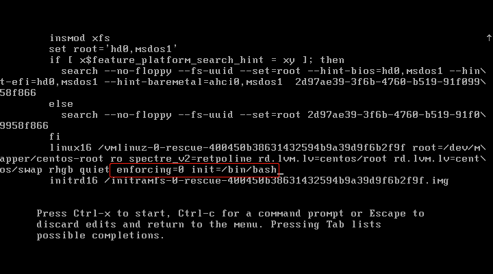 2.在linux16这行最后输入:enforcing=0 init=/bin/bash,然后按ctrl+x,进入shell
