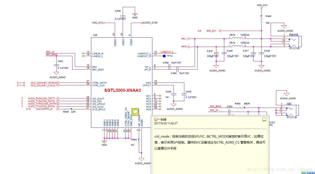sgtl5000 通过I2S接口与IMX6的SSI总线完成音频数据的交换;cpu通过I2C或者SPI完成对CODEC的控制,由于