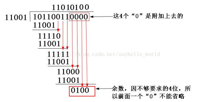 (2) 因为生成多项式的位数为5,根据前面的介绍,得知CRC校验码的位数为4(校验码的位数比生成多项式的位数少1)。因为原数据帧10110011,在它后面再加4个0,得到101100110000,然后把这个数以“模2除法”方式除以生成多项式,得到的余数(即CRC码)为0100,如下所示。