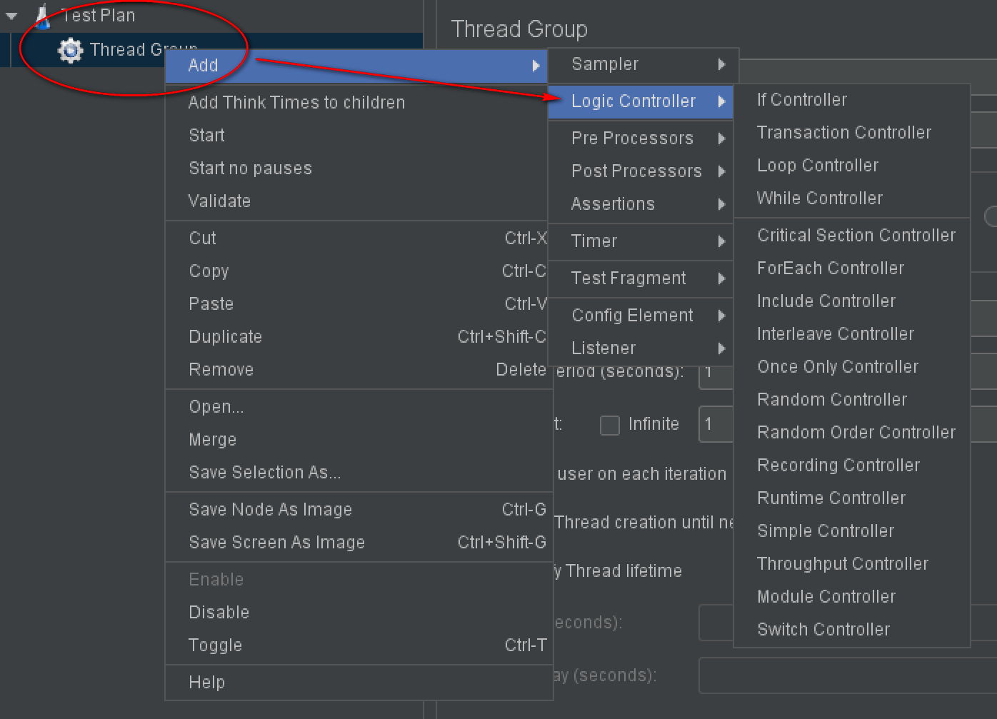 可以通过 测试计划|线程组|逻辑控制器 添加 Logic Controller。